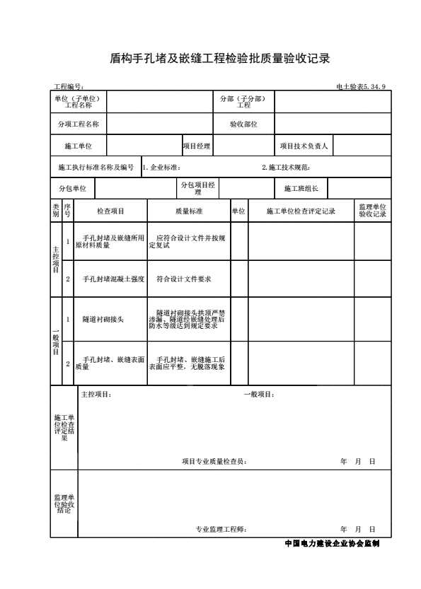 表格名称:电土验表5.34.9 盾构手孔封堵及嵌缝工程检验批质量验收记录