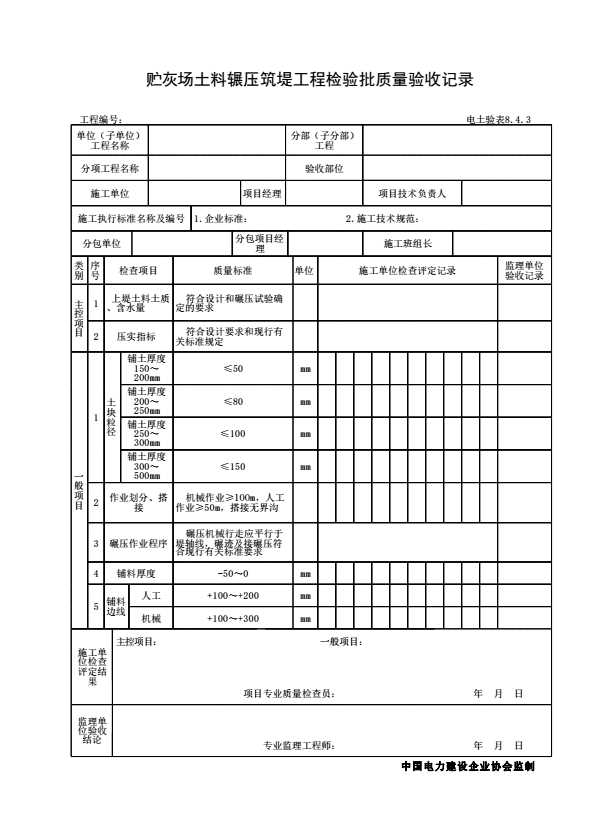 表格名称:电土验表8.4.3 贮灰场土料碾压筑堤工程检验批质量验收记录