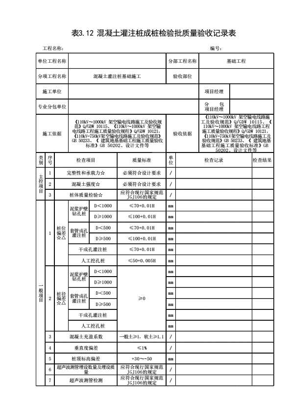 表格名称:表3.12 混凝土灌注桩成桩检验批质量验收记录表