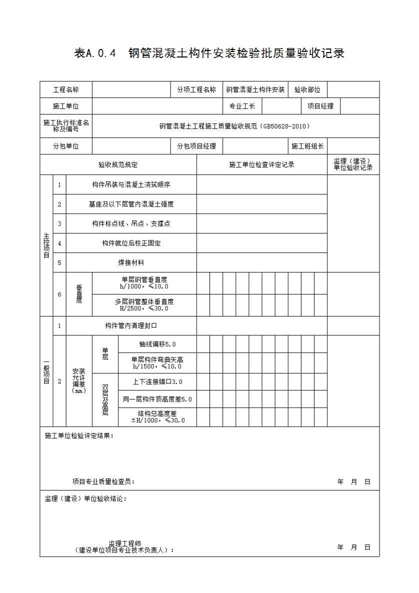 表格名称:表A.0.4 钢管混凝土构件安装检验批质量验收记录