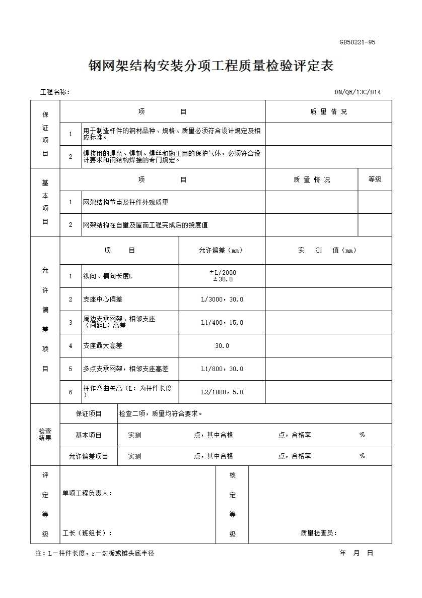 表格名称:钢网架结构安装分项工程质量检验评定表
