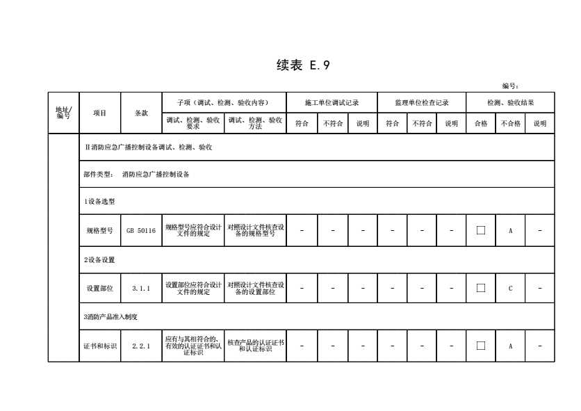 表格名称:表E.9 火灾警报和消防应急广播系统调试、检测、验收记录(续表4)