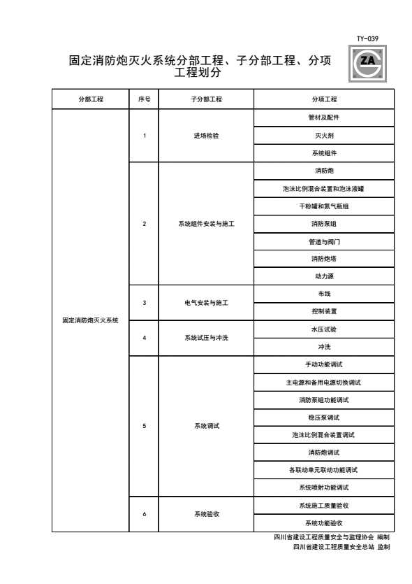 TY-039 固定消防炮灭火系统分部工程、子分部工程、分项工程划分