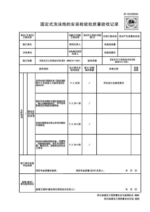 表格名称:XF-01020504 固定式泡沫炮的安装检验批质量验收记录