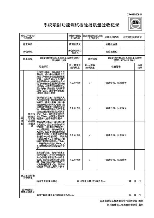 表格名称:XF-03050801 系统喷射功能调试检验批质量验收记录