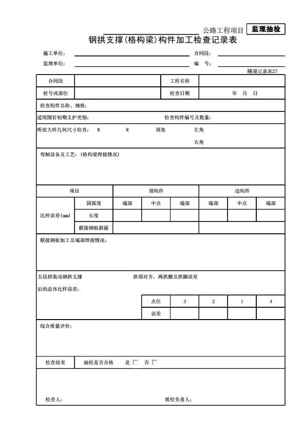 表格名称:钢拱支撑(格构梁)构件加工检查记录表