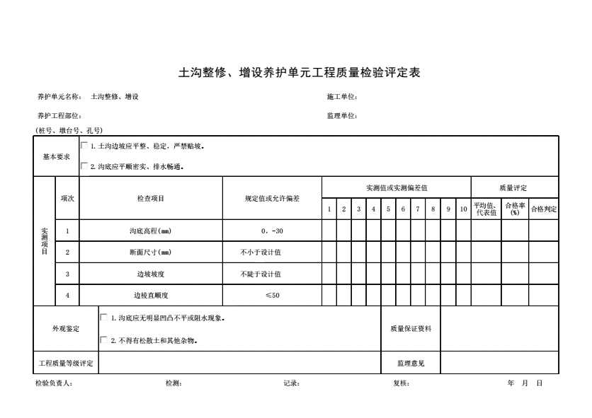 表格名称:土沟整修、增设养护单元工程质量检验评定表