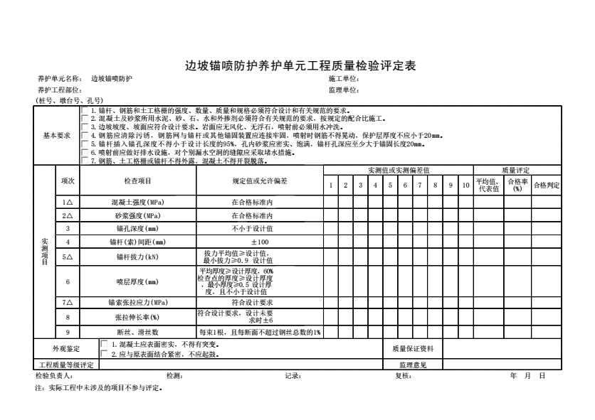 表格名称:边坡锚喷防护养护单元工程质量检验评定表