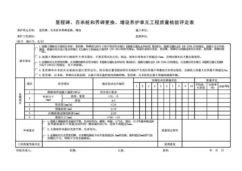 里程碑、百米桩和界碑更换、增设养护单元工程质量检验评定表