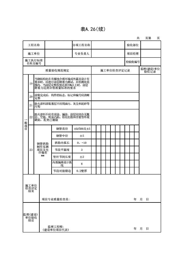 表格名称:表A.26 钢管拱肋制作检验批质量验收记录