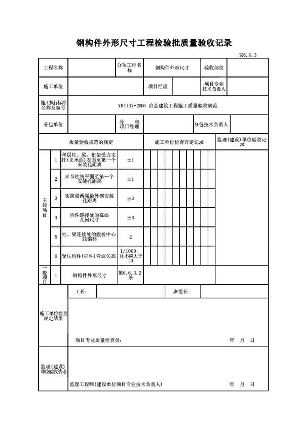 表格名称:表6.6.3 钢构件外形尺寸工程检验批质量验收记录