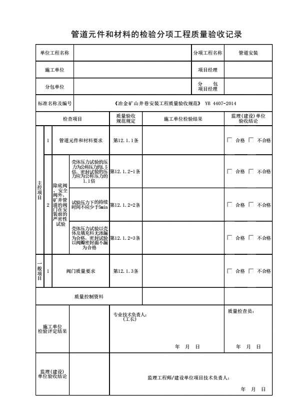 表格名称:管道元件和材料的检验分项工程质量验收记录