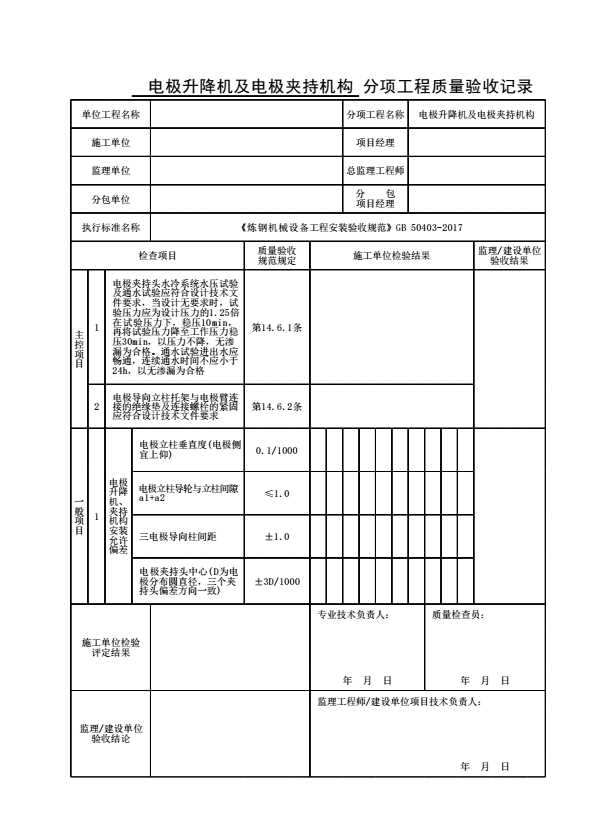 表格名称:电极升降机及电极夹持机构分项工程质量验收记录