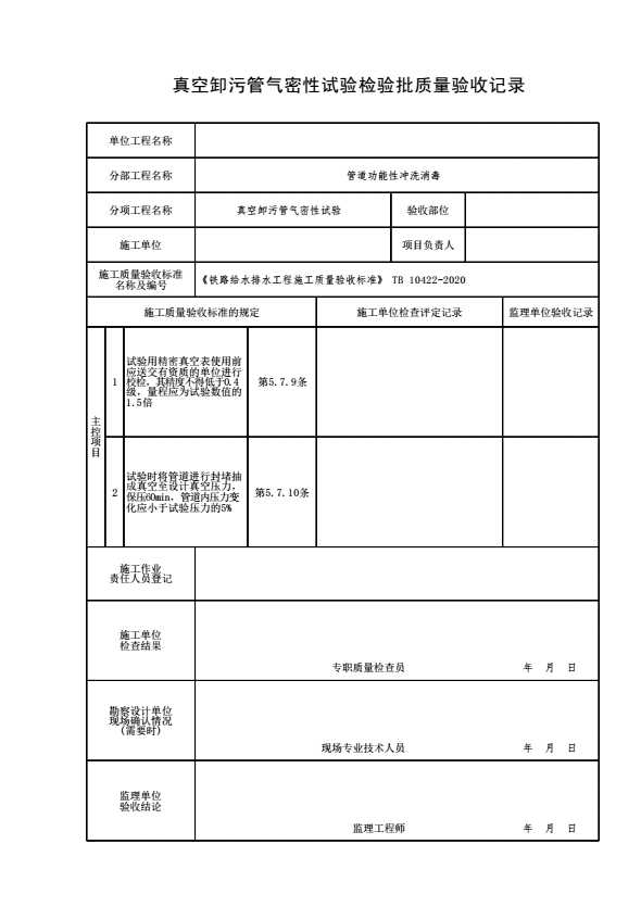 表格名称:真空卸污管道气密性试验检验批质量验收记录