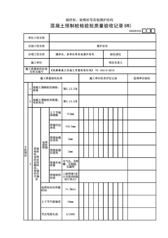 表格名称:04020103 【搅拌桩、旋喷桩等其他围护结构】混凝土预制桩检验批质量验收记录(Ⅷ)