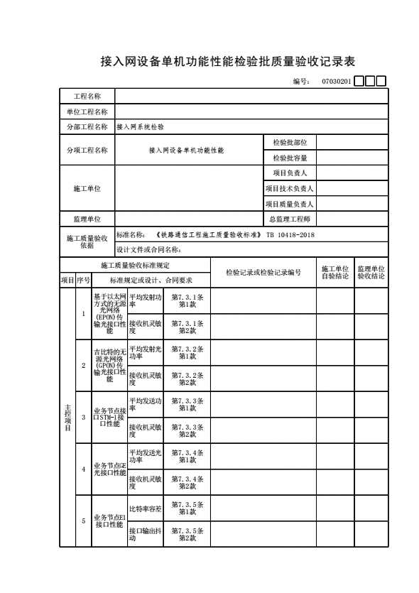 07030201 接入网设备单机功能性能检验批质量验收记录表
