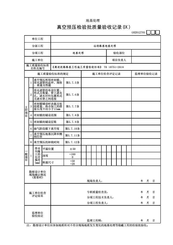 表格名称:G02012701 【地基处理】真空预压检验批质量验收记录(Ⅸ)