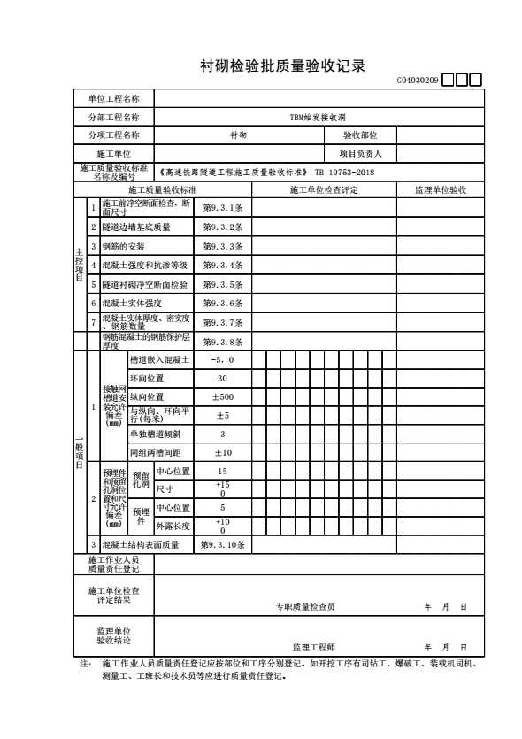表格名称:G04030209 衬砌检验批质量验收记录
