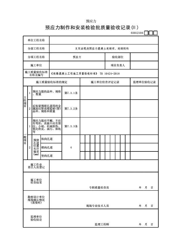 表格名称:03012104 预应力制作和安装检验批质量验收记录(Ⅱ)