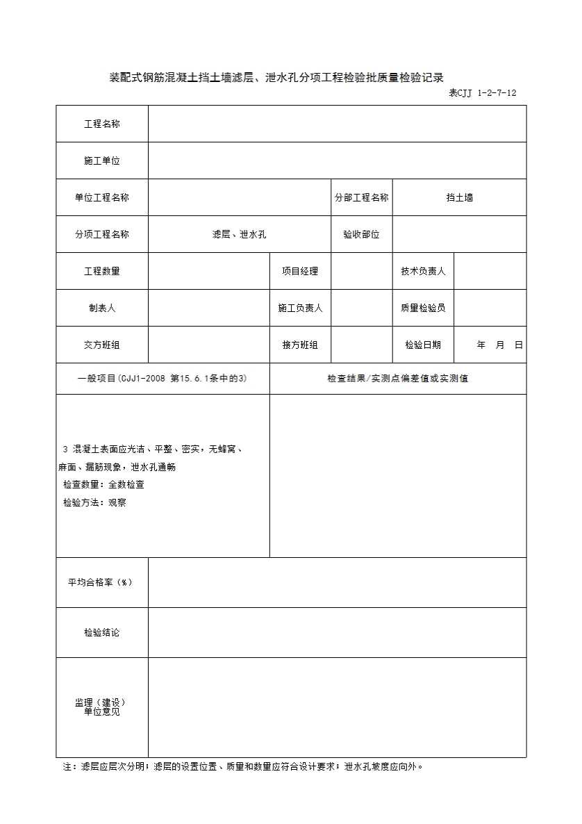 表CJJ 1-2-7-12 装配式钢筋混凝土挡土墙滤层、泄水孔分项工程检验批质量检验记录