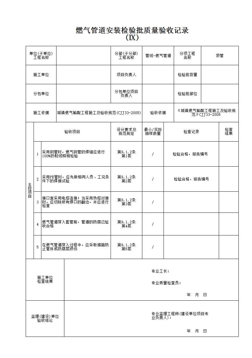 表格名称:燃气管道安装检验批质量验收记录(Ⅸ)