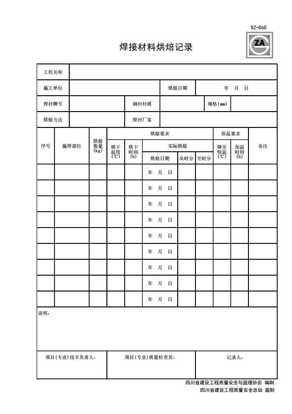 表格名称:SZ-060 焊接材料烘焙记录