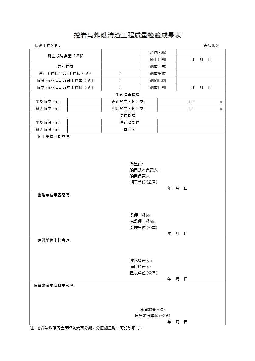 表格名称:表A.0.2 挖岩与炸礁清渣工程质量检验成果表