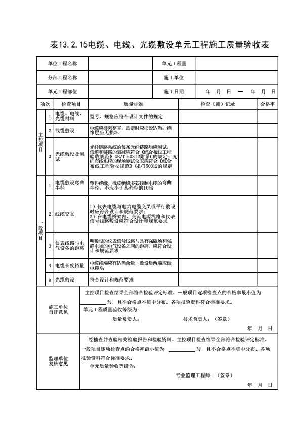 表格名称:表13.2.15 电缆、电线、光缆敷设单元工程施工质量验收表