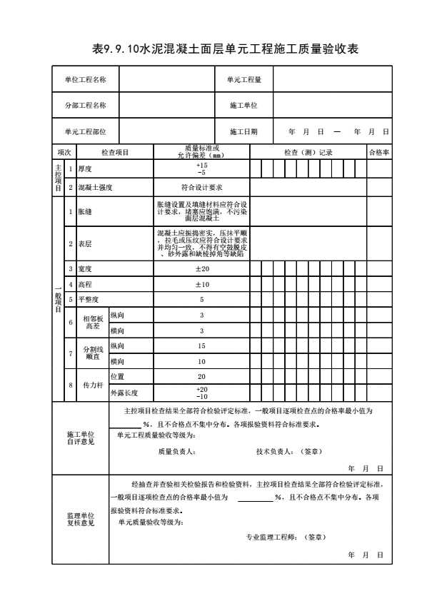 表9.9.10 水泥混凝土面层单元工程施工质量验收表