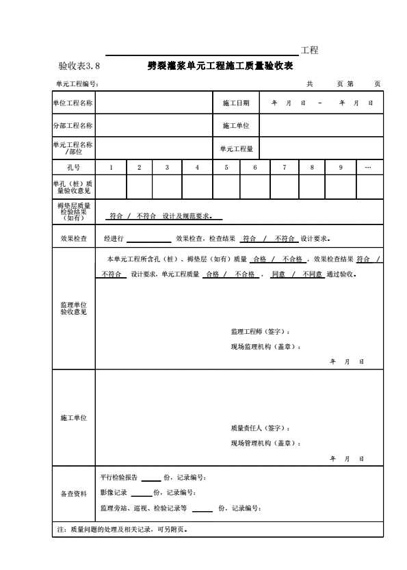 表格名称:表3.8 劈裂灌浆单元工程施工质量验收表
