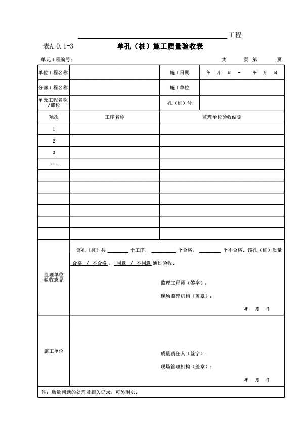 表格名称:表A.0.1-3 单孔(桩)施工质量验收表