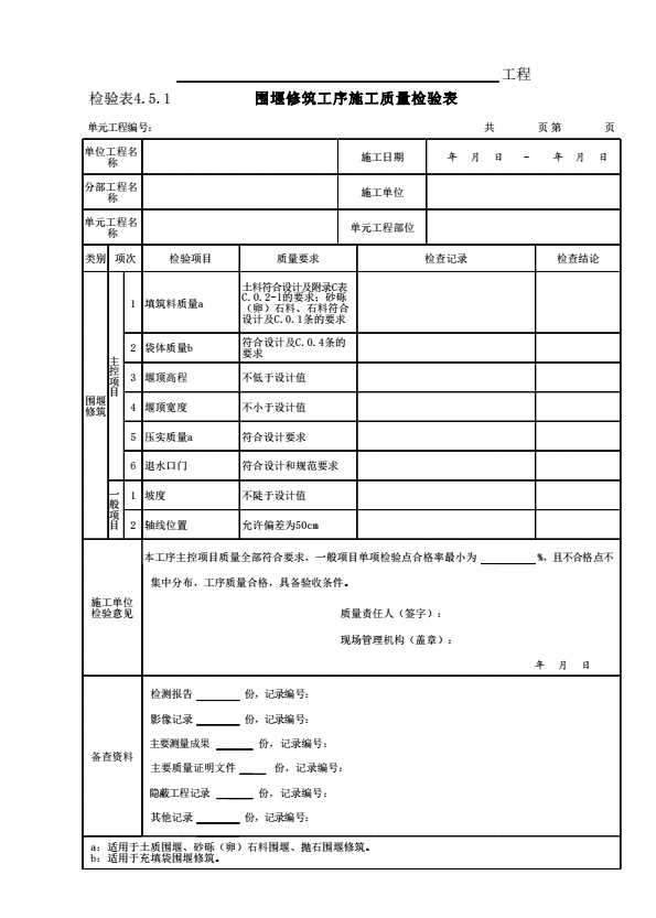 表格名称:表4.5.1 围堰修筑工序施工质量检验表