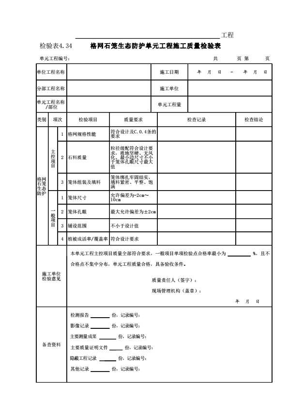 表格名称:表4.34 格网石笼生态防护单元工程施工质量检验表