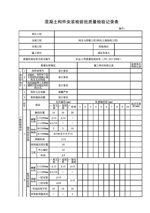 表格名称:混凝土构件安装检验批质量检验记录表