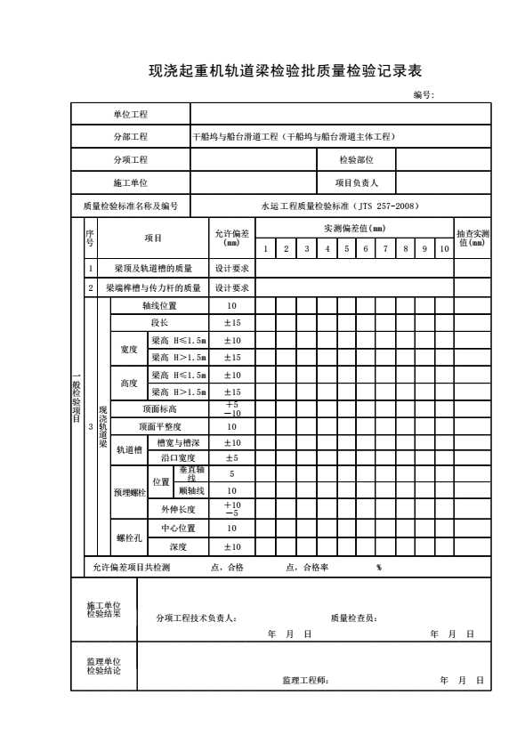 表格名称:现浇起重机轨道梁检验批质量检验记录表
