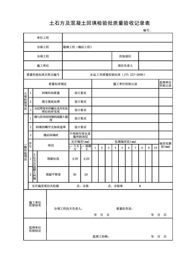 表格名称:土石方及混凝土回填检验批质量验收记录表