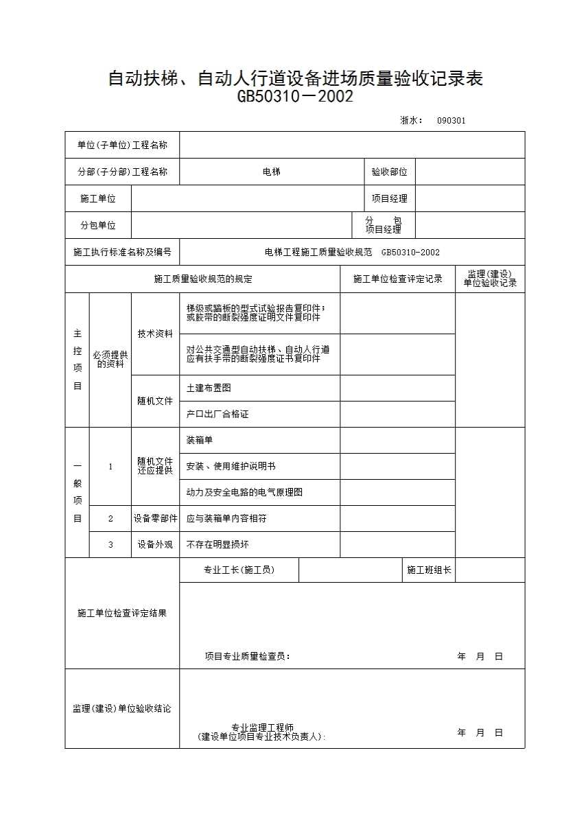 表格名称:240 自动扶梯、自动人行道设备进场质量验收记录表