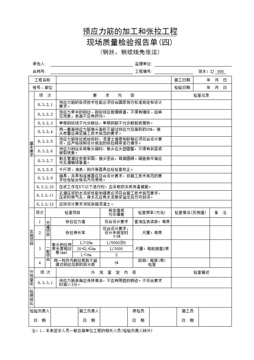 表格名称:浙水:ZJ805 预应力筋的加工和张拉工程现场质量检验报告单(四)