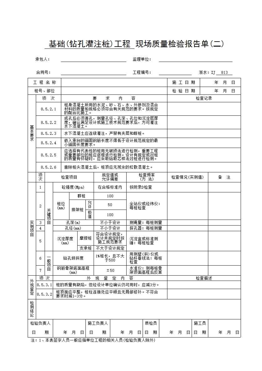 表格名称:浙水:ZJ813 基础(钻孔灌注桩)工程现场质量检验报告单(二)