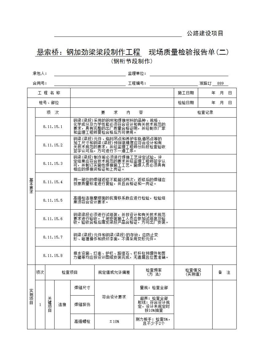 表格名称:浙路ZJ889 悬索桥:钢加劲梁梁段制作工程现场质量检验报告单(二)
