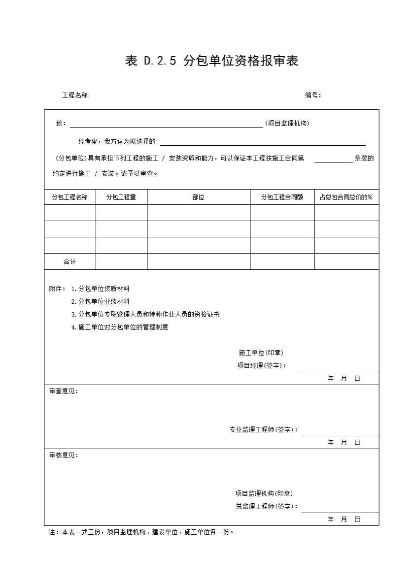 表格名称:表 D.2.5 分包单位资格报审表