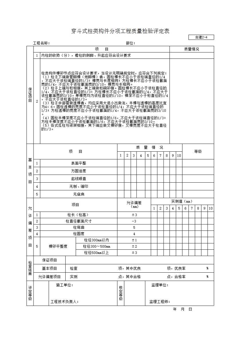 表格名称:穿斗式柱类构件分项工程质量检验评定表