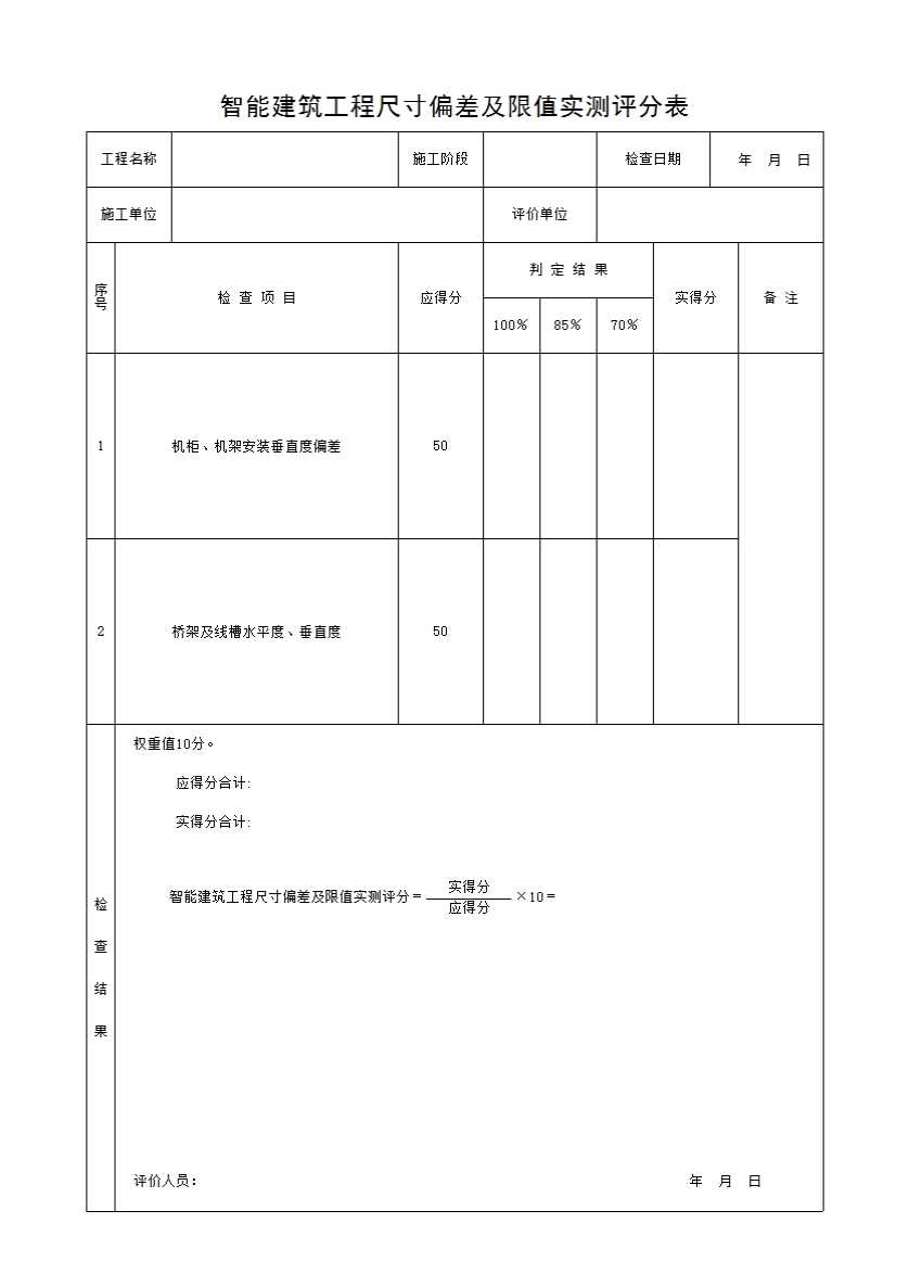 表格名称:智能建筑工程尺寸偏差及限值实测评分表