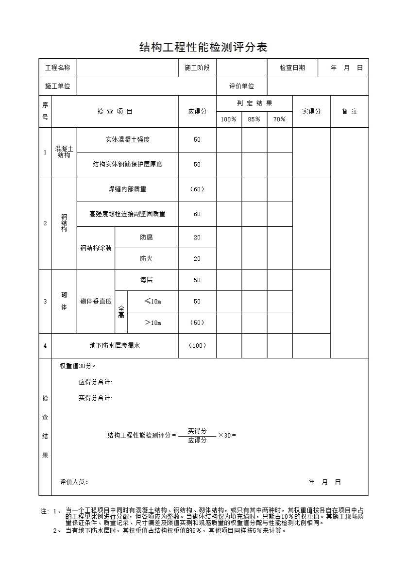 结构工程性能检测评分表
