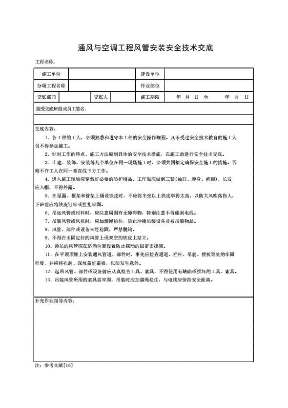 表格名称:通风与空调工程风管安装安全技术交底