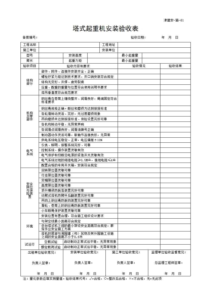 表格名称:津建安-施-61 塔式起重机安装验收表