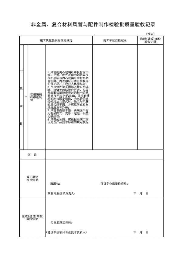 表格名称:非金属、复合材料风管与配件制作检验批质量验收记录
