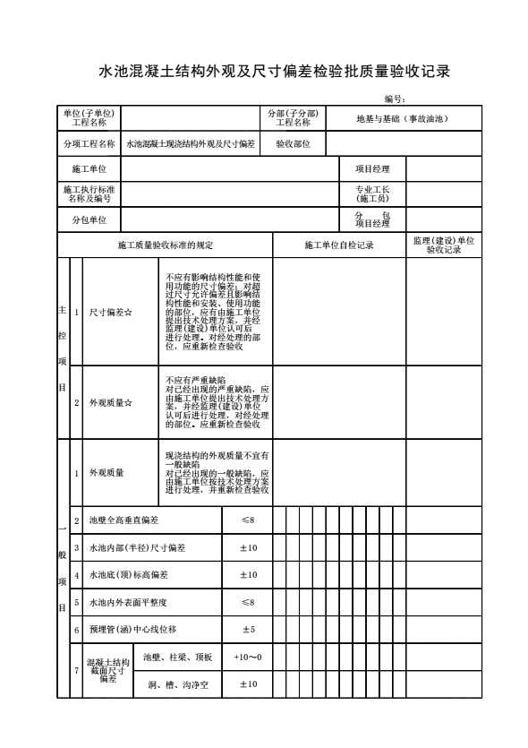 表格名称:水池混凝土结构外观及尺寸偏差检验批质量验收记录
