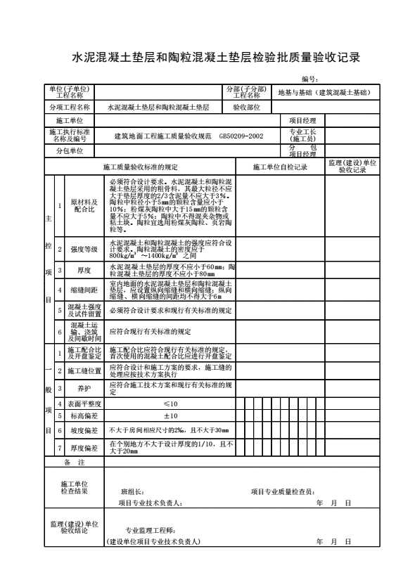 表格名称:水泥混凝土垫层和陶粒混凝土垫层检验批质量验收记录