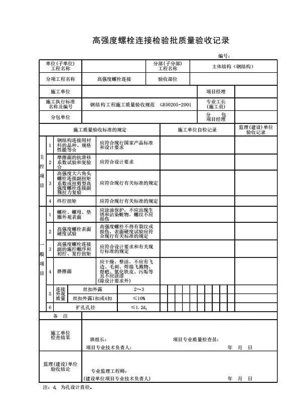 高强度螺栓连接检验批质量验收记录